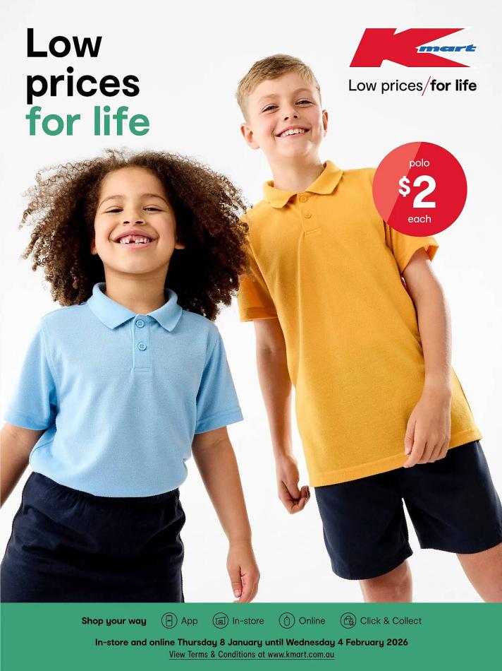 Save money with Kmart Specials. Don't miss the specials on offer now from Kmart by checking out the Kmart catalogue valid from 08 janvier until 04 février. View the weekly Kmart catalogue to see this week's specials valid from 08 janvier until 04 février. Share your opinion about the products you love and bought in Kmart. Browse the latest catalogue and offers of all your favourite stores and dont forget to subscribe to our newsletter to receive exclusive offers and the latest catalogues directly on your mail.