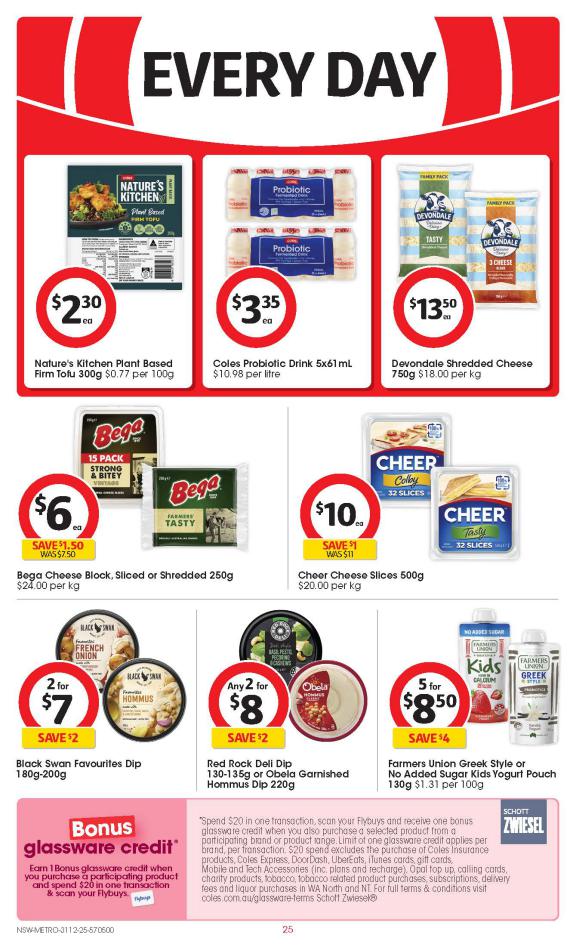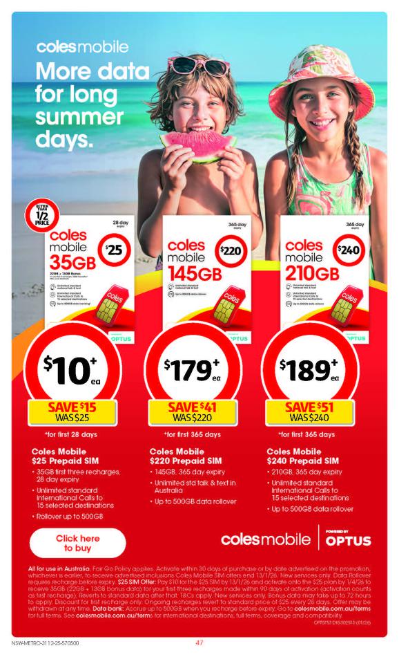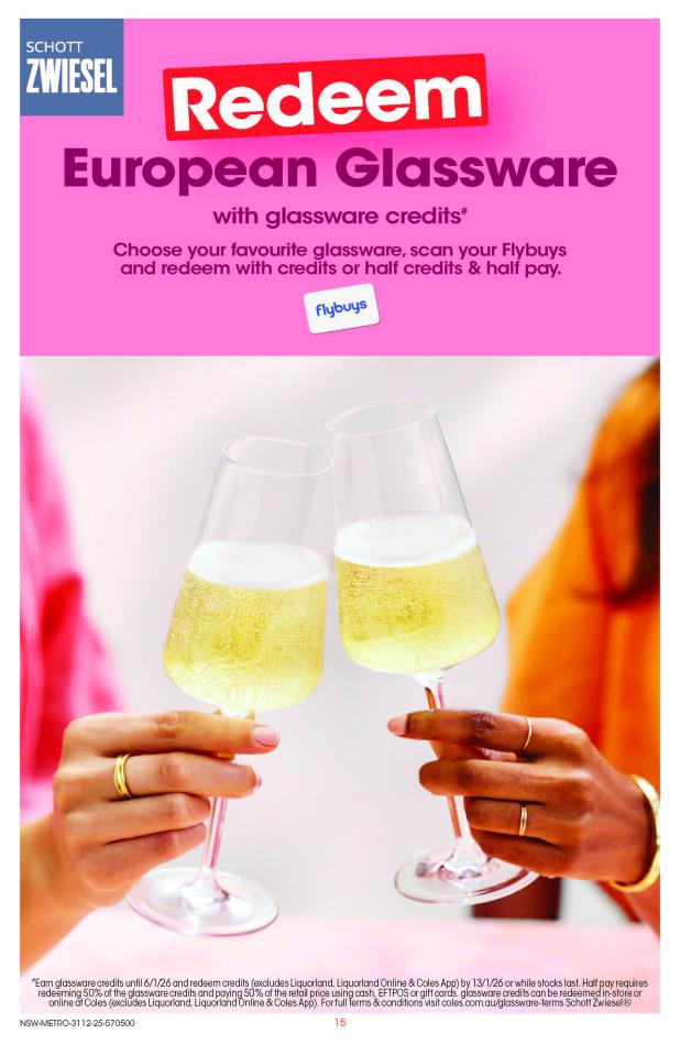 Save money with Coles Specials. Don't miss the specials on offer now from Coles by checking out the Coles catalogue valid from 31 décembre until 06 janvier. View the weekly Coles catalogue to see this week's specials valid from 31 décembre until 06 janvier. Share your opinion about the products you love and bought in Coles. Browse the latest catalogue and offers of all your favourite stores and dont forget to subscribe to our newsletter to receive exclusive offers and the latest catalogues directly on your mail.