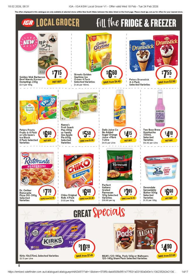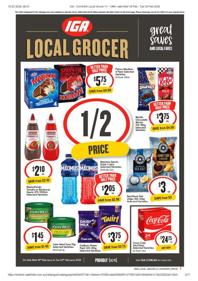 Save money with iga Specials. Don't miss the specials on offer now from iga by checking out the iga catalogue valid from 18 février until 24 février. View the weekly iga catalogue to see this week's specials valid from 18 février until 24 février. Share your opinion about the products you love and bought in iga. Browse the latest catalogue and offers of all your favourite stores and dont forget to subscribe to our newsletter to receive exclusive offers and the latest catalogues directly on your mail.